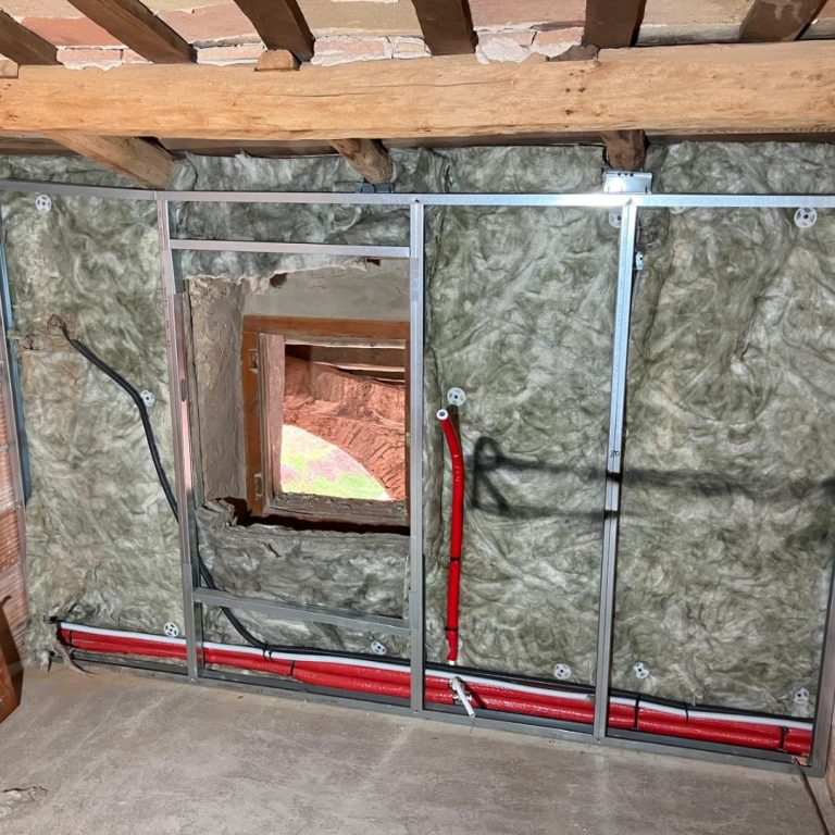 Hem construït un envà de guix laminat amb aïllament de llana mineral, que aporta confort tèrmic. També hem executat un trasdossat amb el mateix material, millorant encara més l’eficiència energètica. Per acabar, hem instal·lat un fals sostre de fibres vegetals amb perfileria blanca, aportant un acabat modern, net i sostenible.